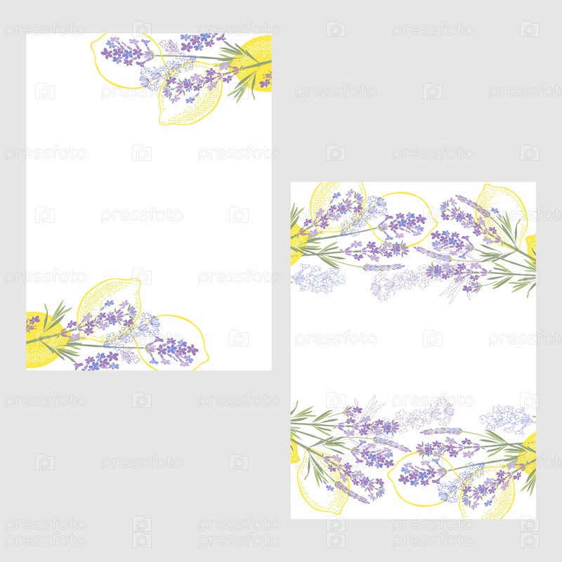 Готовый дизайн на средиземноморскую тематику с лимонами и лавандой и местом для текста. Векторный макет декоративной поздравительной открытки или приглашения дизайн фона. Два разных варианта