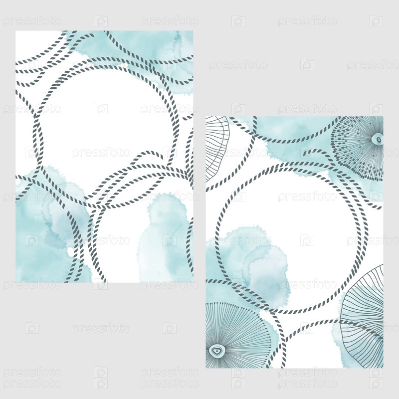 Набор карточек с водорослями, узлами, веревками, акварельными пятнами и местом для текста. Концепция морского орнамента. плакат, пригласить. Векторный макет декоративной поздравительной открытки или приглашения дизайн фона