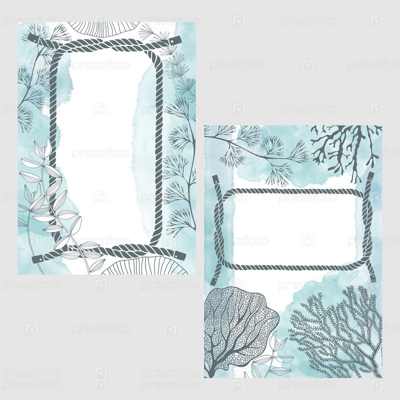 Готовый дизайн на морскую тематику с водорослями, узлами, веревками, акварельными пятнами и местом для текста. Векторный макет декоративной поздравительной открытки или приглашения дизайн фона. Два разных варианта