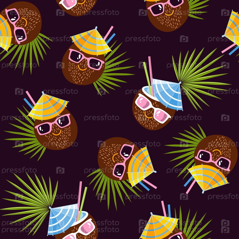 Очаровательные кокосы. Бесшовный узор на черном фоне. Вектор. Идеально подходит для шаблонов дизайна, обоев, упаковки, ткани и текстиля