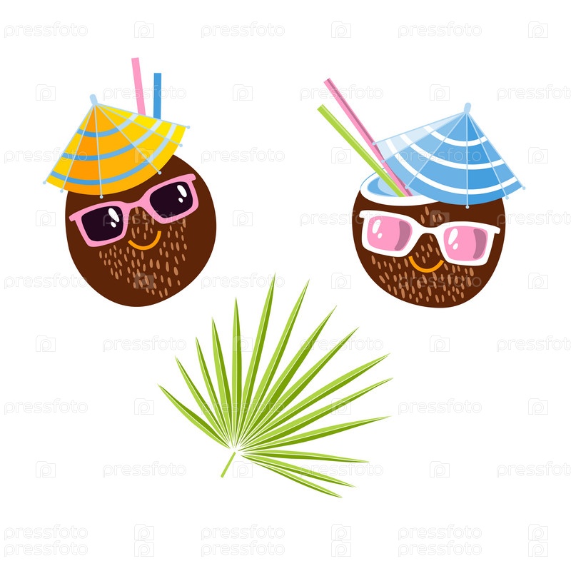 Милые кокосы в солнцезащитных очках и пальмовом листе. Мультяшные летние персонажи. Векторная иллюстрация на белом. Идеально подходит в качестве элемента дизайна для тропических вечеринок, приглашений, наклеек и многого другого