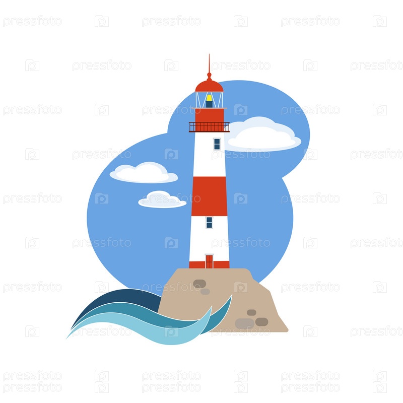 Морской маяк морской навигационный маяк. Морская башня, небо, облака и море. Векторная иллюстрация изолирована на белом