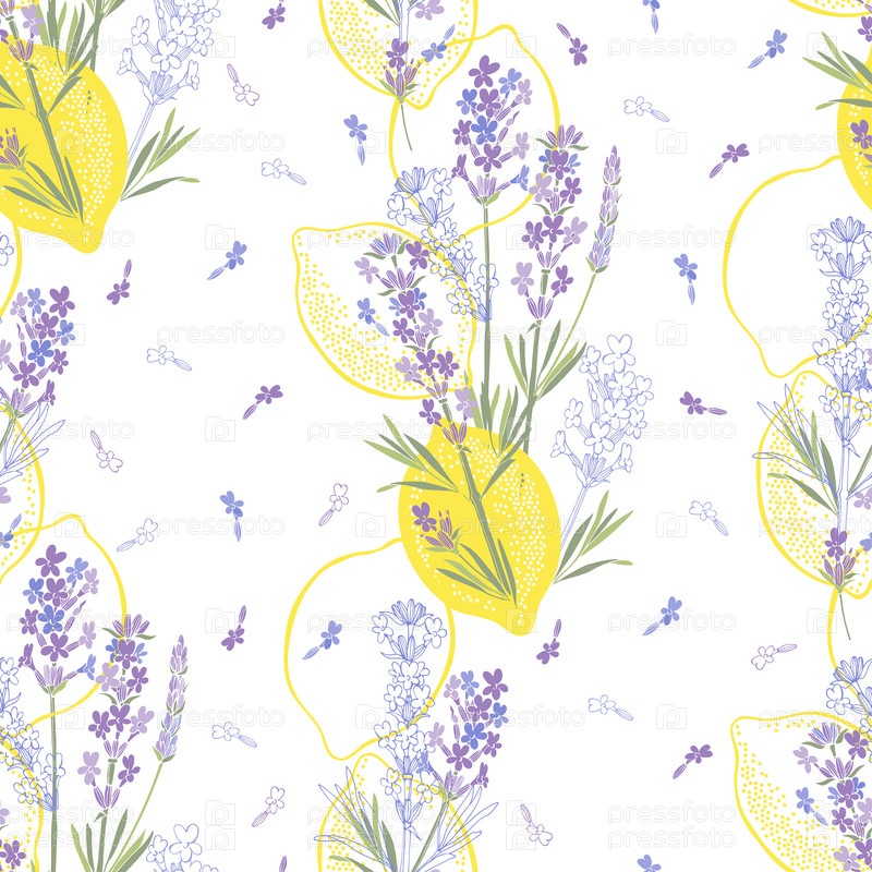 Цветочный фон с нарисованными вручную цветами лаванды и лимонами. Векторная иллюстрация на белом