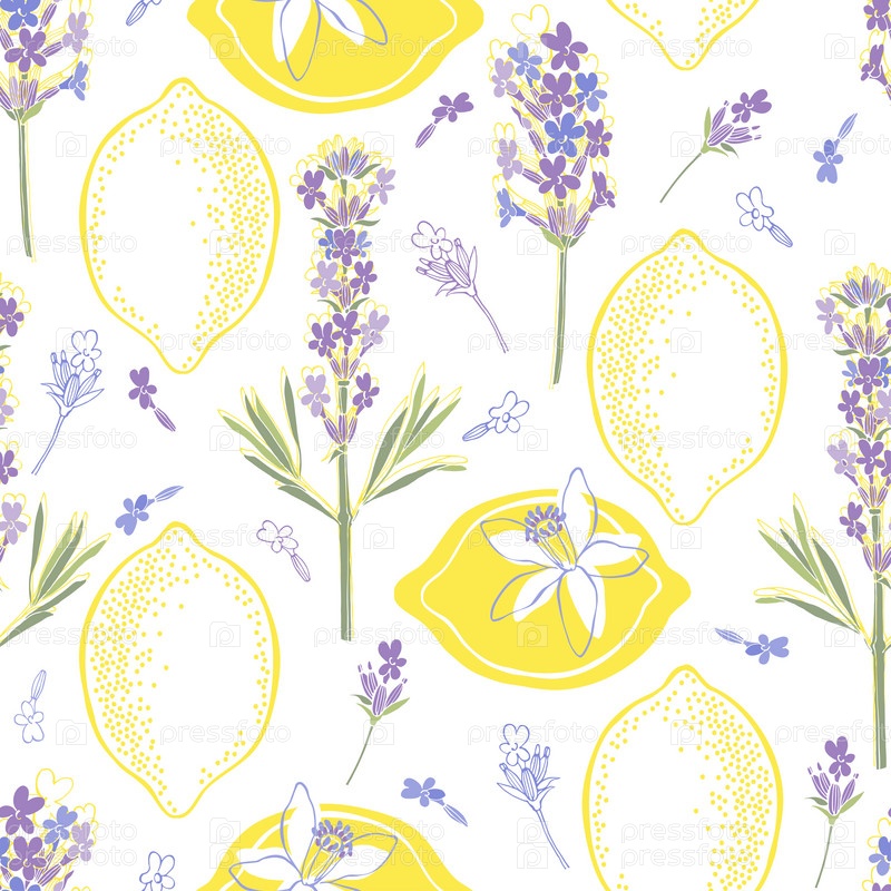 Цветочный фон с нарисованными вручную цветами лаванды и лимонами. Векторная иллюстрация на белом