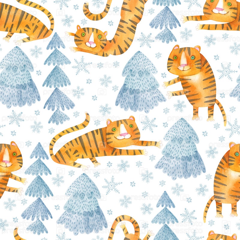 Симпатичные тигры, елки и снежинки. Ручная роспись акварелью бесшовный узор на белом. Новогодняя и рождественская иллюстрация. Животное символ нового 2022 года