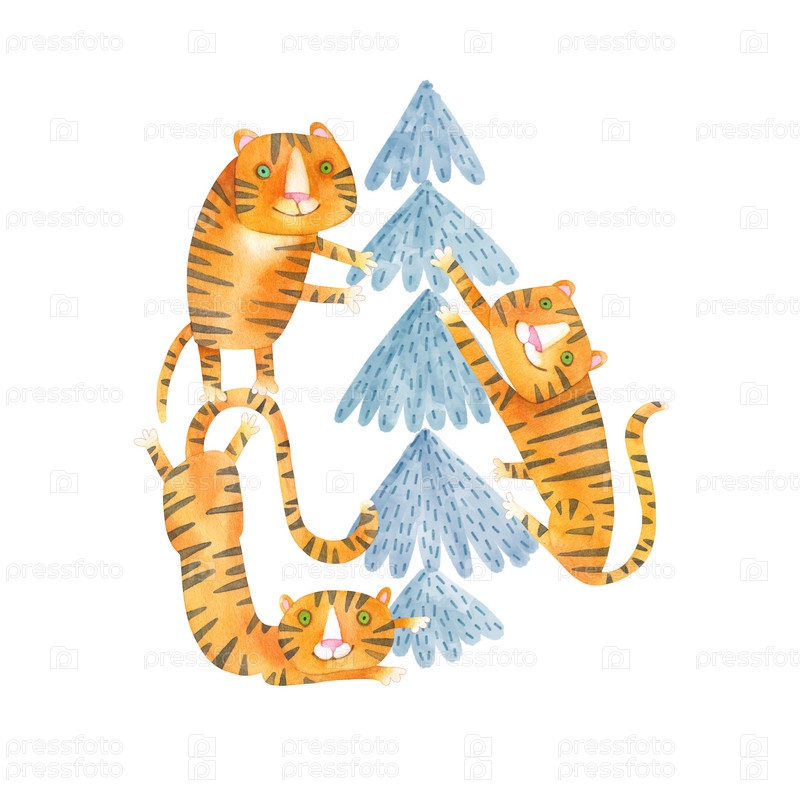 Милые тигры, новогодняя елка. Праздничная акварельная иллюстрация на белом. Идеально подходит для приглашений, поздравительных открыток и в качестве элемента дизайна. Животное символ нового 2022 года