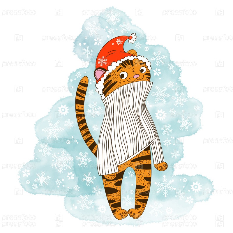 Симпатичный мультяшный тигр в шляпе Санты, свитер на синем акварельном фоне. Векторная иллюстрация на белом. Изолированный персонаж. Идеально подходит для приглашений, поздравительных открыток и в качестве элемента дизайна. Животное символ нового 2022 год