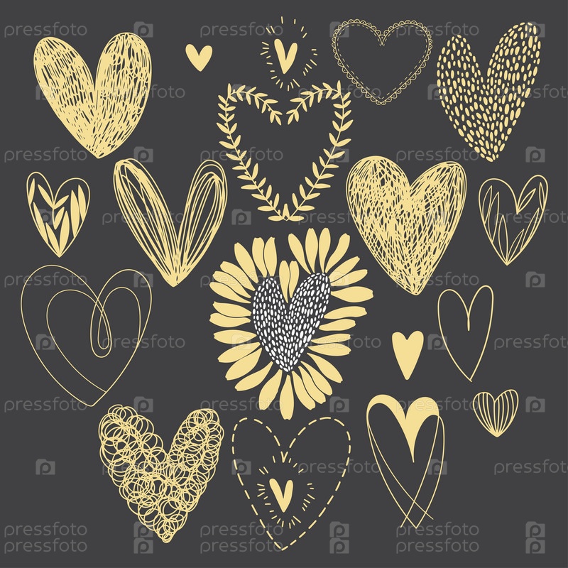 Большой набор нарисованных вручную сердец. Ручной обращается золотые сердца, изолированные на черном фоне. Векторная иллюстрация для вашего графического дизайна
