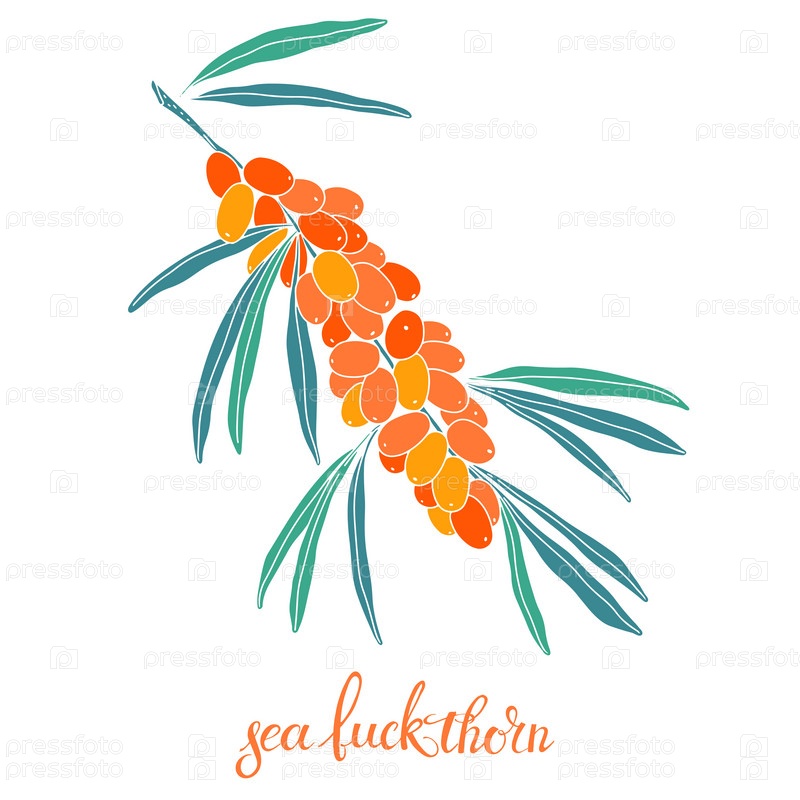 Филиал облепихи, ягоды и листья. Косметическое и лечебное растение. Векторная ручная иллюстрация. Изолированный элемент на белом