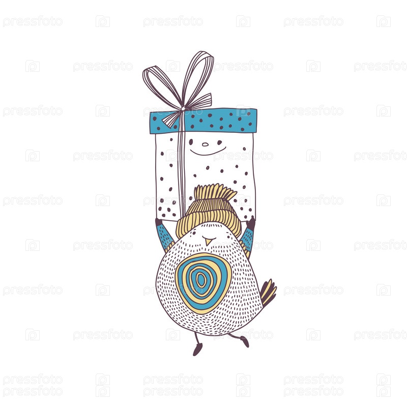 Мультяшная птица с подарочными коробками на белом. Праздничная иллюстрация. Векторные символы. Идеально подходит для праздничных приглашений, открыток, шаблонов оформления обложек, обоев, упаковки и текстиля