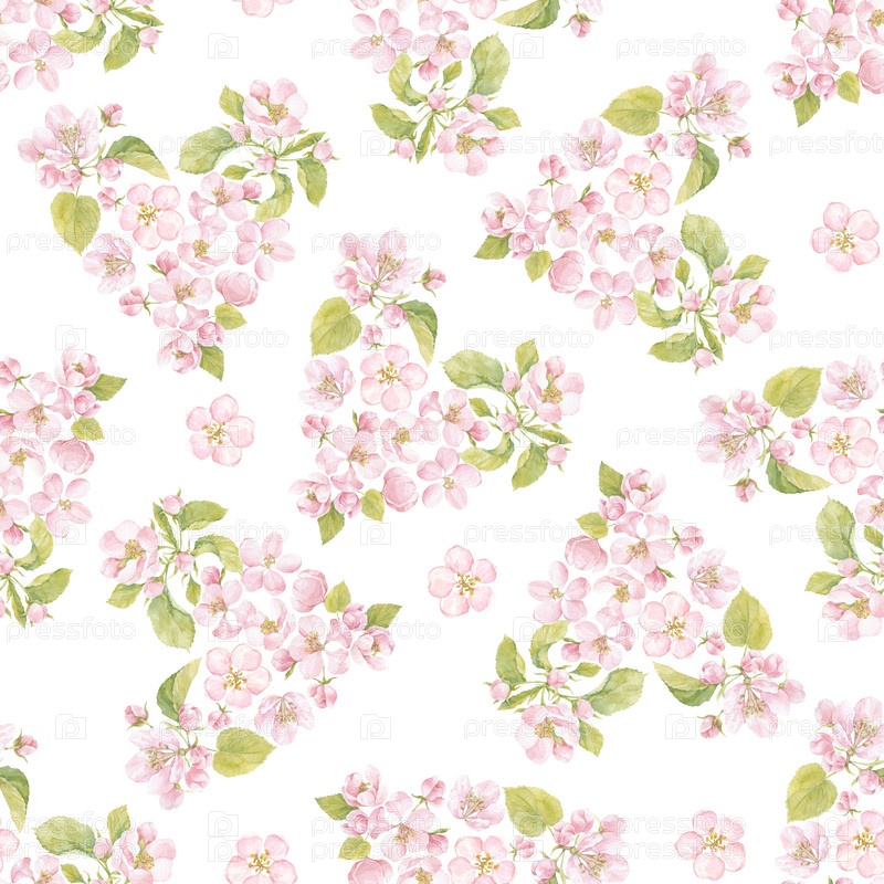Бесшовный рисунок с цветущими ветвями яблони на белом. Элементы в форме сердца. Цветочный акварельный фон. Идеально подходит для шаблонов дизайна, обоев, упаковки, ткани и текстиля