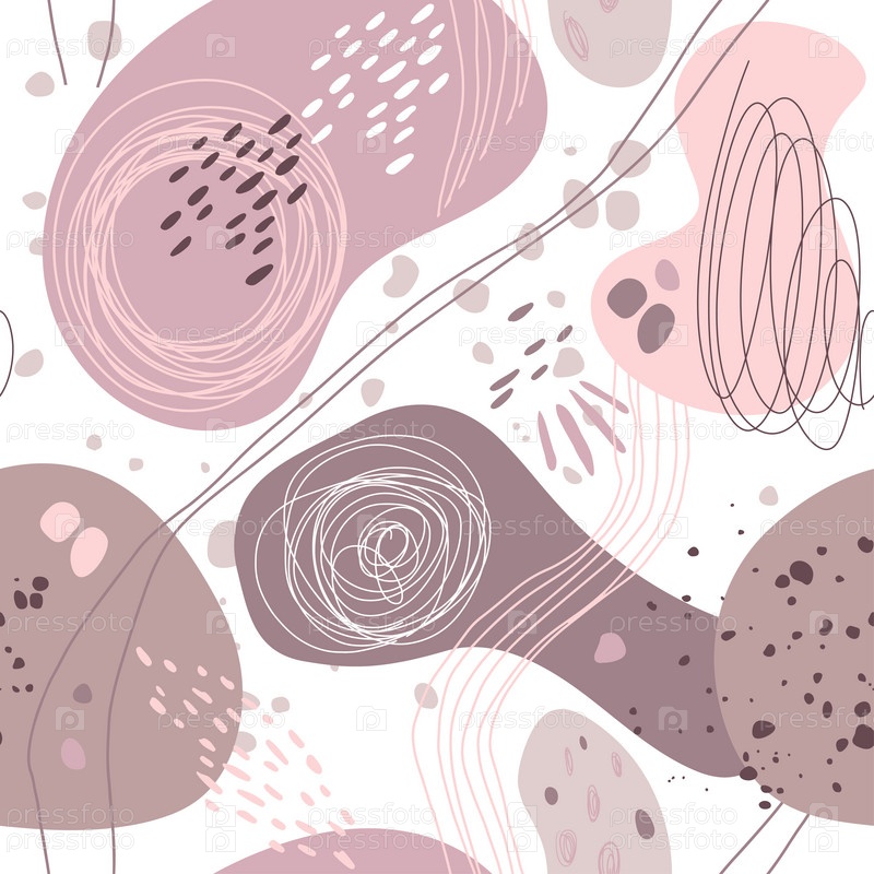 Абстрактный фон. Бесшовный векторный рисунок с завитками и простыми формами на белом. Идеально подходит для шаблонов дизайна, обоев, упаковки, ткани и текстиля