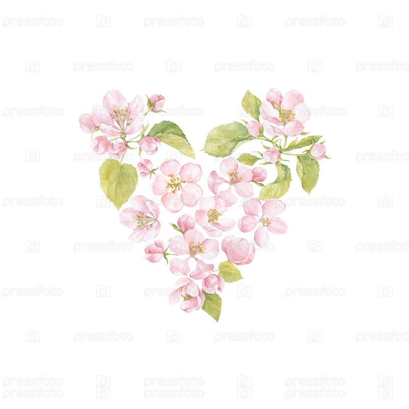 Цветущие ветки яблони на белом. Композиция в форме сердца. Акварель. Идеально подходит для поздравительных открыток и приглашений или элемент вашего дизайна