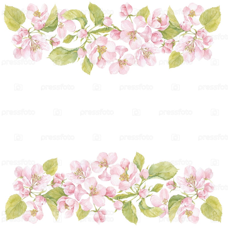 Цветочная акварельная рамка с цветущими ветвями яблони на белом. Приглашение, поздравительная открытка или элемент вашего дизайна