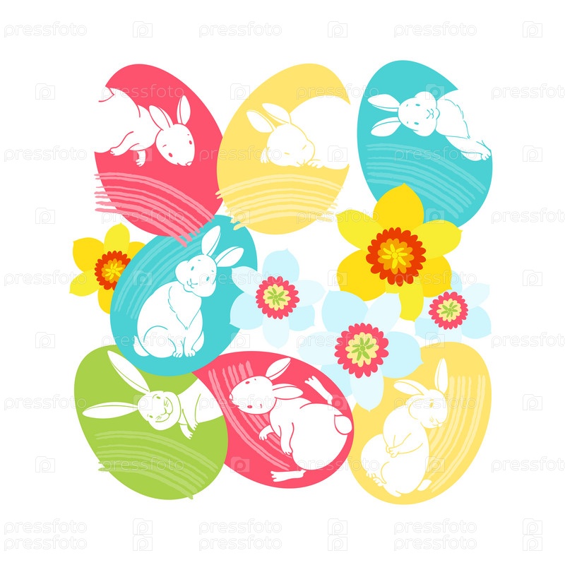 Пасхальные картинки с красочными яйцами, милыми кроликами и нарциссами. Векторная иллюстрация на белом. Идеально подходит в качестве поздравительной открытки, приглашения, элемента дизайна