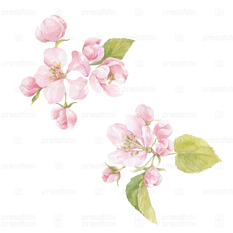 Цветок яблони с цветами и зелеными листьями на белом фоне. Акварель изолированные цветочные элементы. Идеально подходит для поздравительных открыток, приглашений, текстильного дизайна, печати