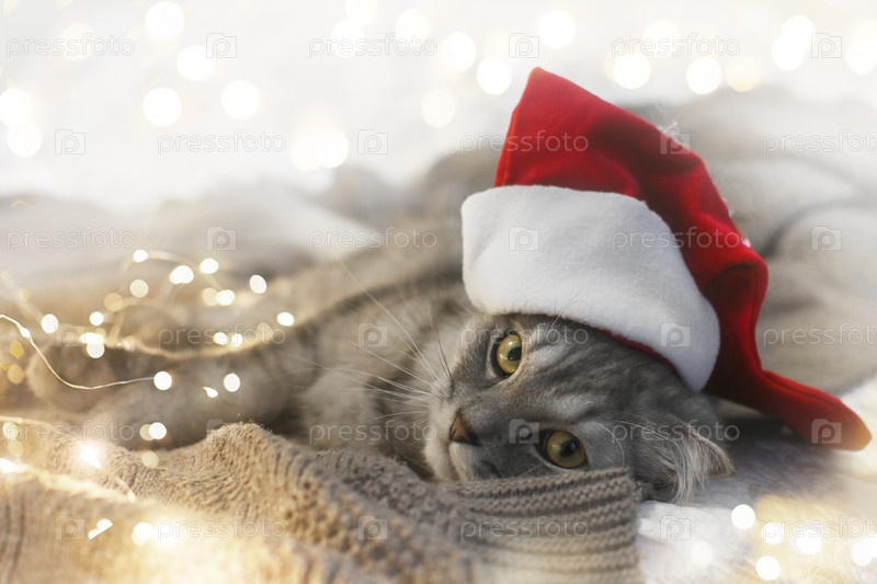 Рождественский кот лежит в ярких гирляндах на теплом вязаном одеяле. Крупный план. Настоящее новогоднее фото. вертикальный