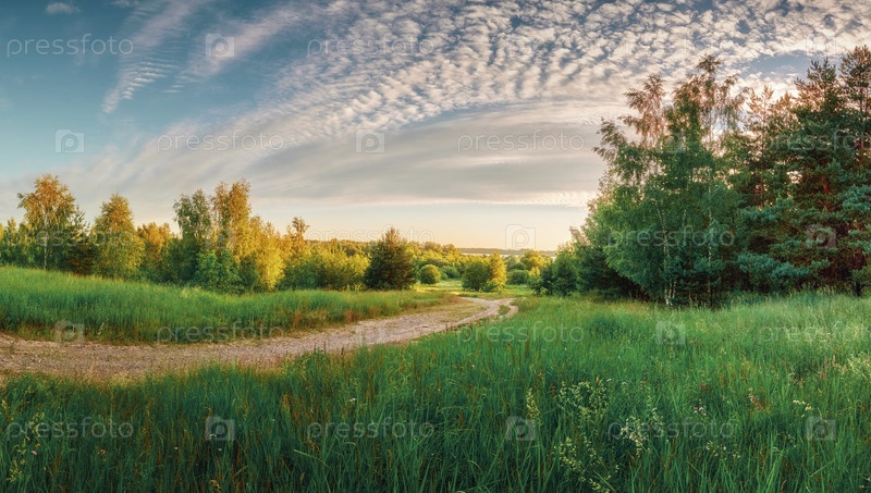 Живописный вечерний пейзаж. Грунтовая дорога спускается с холма среди невысоких деревьев