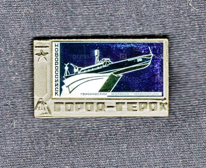 Советский металлический значок с изображением торпедного катера и надписью на русском языке "Новороссийск-город-герой" из серии "Города-герои СССР". Фалеристика. Екатеринбург, Россия-07.04.2020: