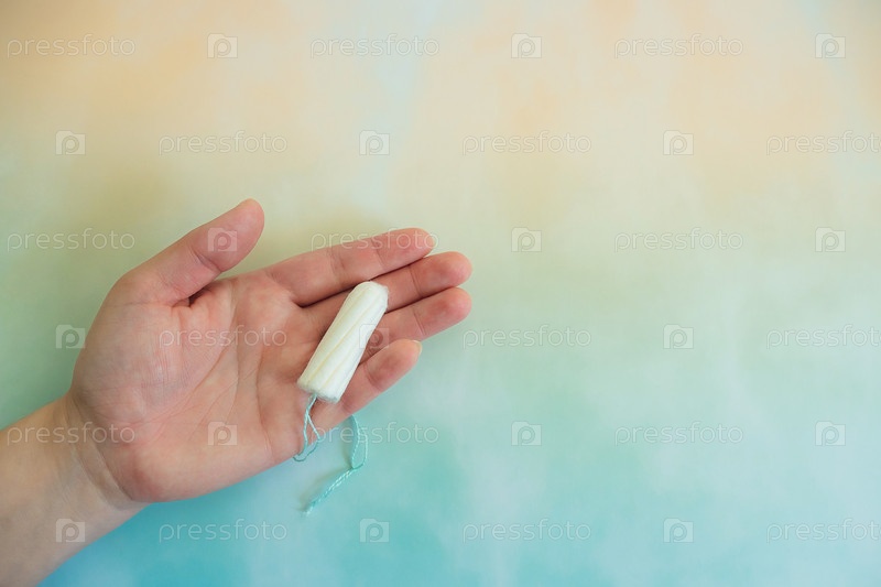 Женская рука с гигиеническим тампоном на желтом и синем градиентном фоне с копировальным пространством вокруг. Тема менструации и женского здоровья