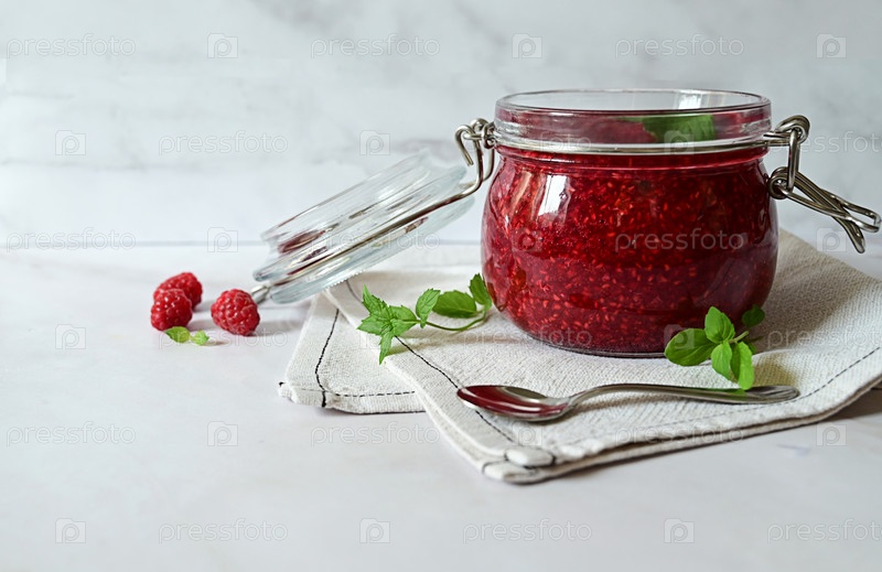Малиновое варенье в стеклянной банке на белом фоне, чай с малиной, витамины для тела