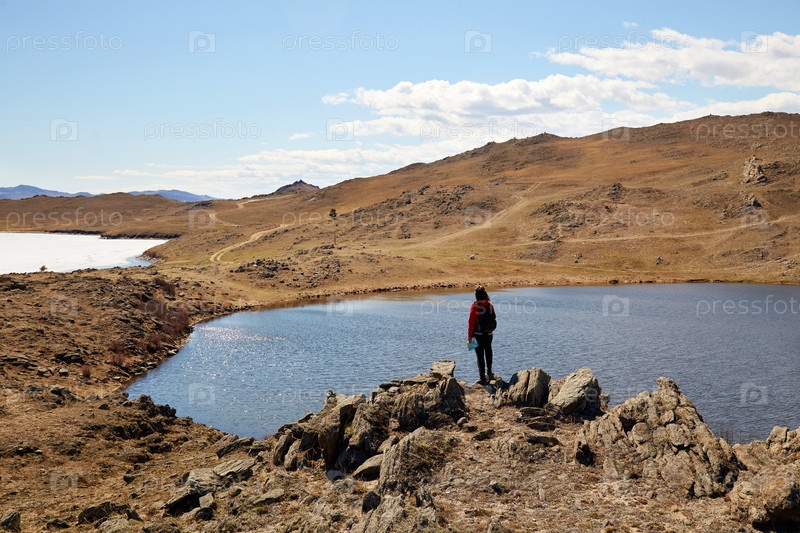Девушка путешествует по острову Ольхон весной. Холмистая местность, озеро в форме сердца