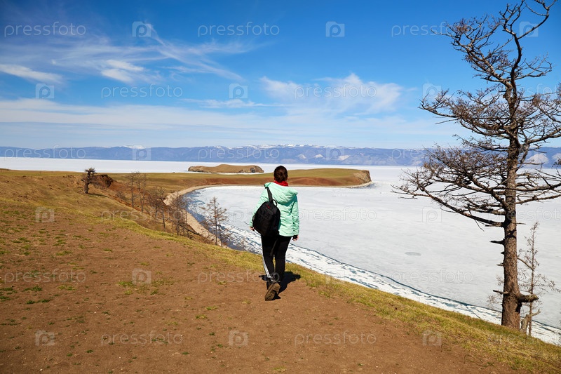Байкал весной. Время таяния льда на озере. Женщина, путешествующая одна по острову Ольхон
