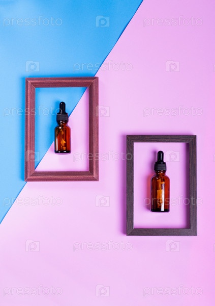 Стеклянная бутылка-капельница внутри рамы на розовом и синем геометрическом фоне. Презентация косметических продуктов. Плоская планировка