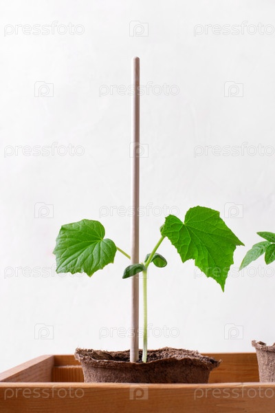 Рассада огурца со стейком в торфяном горшке на белом. Садоводство и весенняя посадка