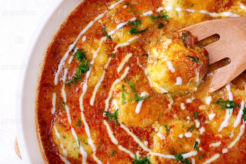 Малайская кофта с йогуртом и свежей зеленью. Горячее блюдо с картофелем и сырными шариками панир в томатном соусе подается на сковороде. Индийская кухня. Вид сверху