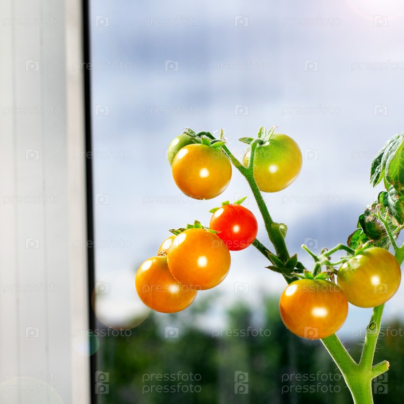 На застекленном балконе созревают маленькие помидоры. Выращивание самоопыляющихся овощей в домашних условиях. Оконная ферма. Облачное небо и улица на заднем плане