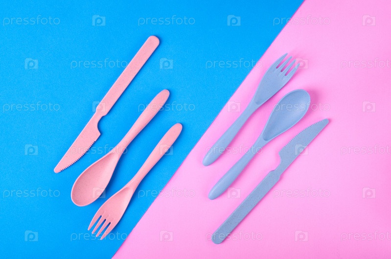 Набор столовых приборов из пшеничной соломы розового и синего цветов на геометрическом фоне. Портативная многоразовая посуда. Концепция школьного обеда. Плоская планировка