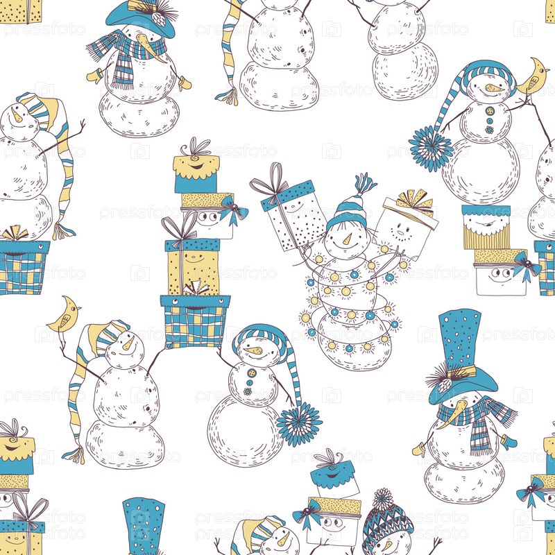 Бесшовный рисунок со снеговиками и подарочными коробками на белом. Праздничный фон. Вектор. Идеально подходит для приглашений, открыток, обоев, упаковки и текстиля