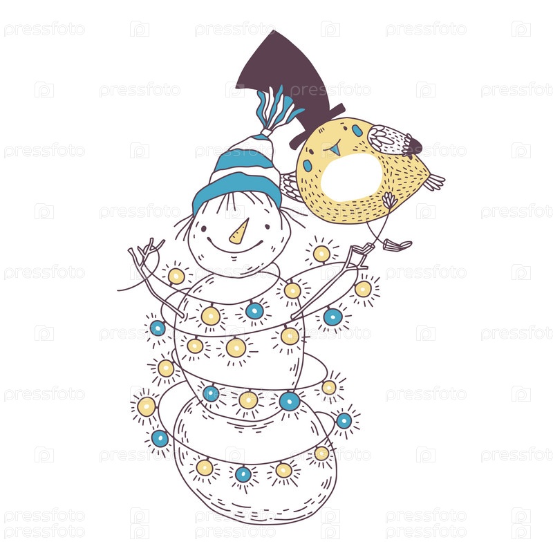 Праздничная векторная иллюстрация с мультяшным снеговиком и очаровательной птицей на белом. Идеально подходит для приглашений, открыток, шаблонов дизайна обложки