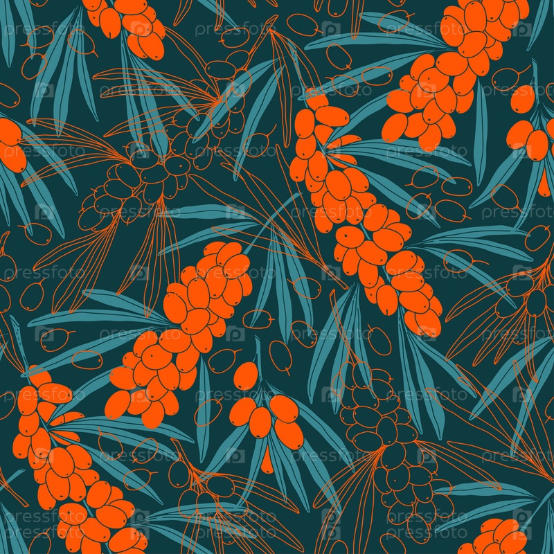 Бесшовный рисунок с веткой облепихи, ягодами и листьями. Вектор. Идеально подходит для шаблонов дизайна, обоев, упаковки, ткани и текстиля