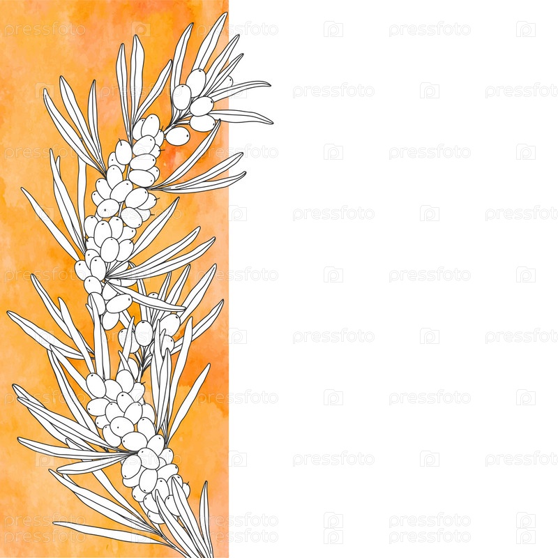 Дизайн с ветвями облепихи и место для текста. Цветочная вертикальная граница на оранжевом акварельном фоне. Макет декоративной поздравительной открытки, шаблона рамки или фона дизайна приглашения