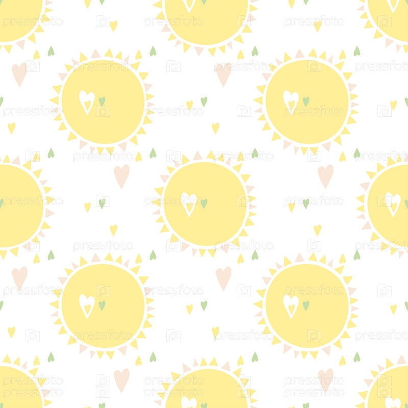 Бесшовный векторный рисунок с солнцем и сердцами на белом. Абстрактная текстура. Идеально подходит для шаблонов дизайна, обоев, упаковки, ткани и текстиля