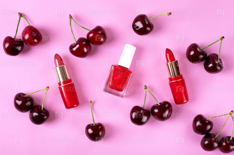 Красная помада и лак для ногтей на розовом фоне с вишней. Плоская планировка с косметикой