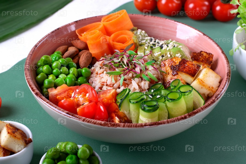 Веганская поке с жареным тофу, помидорами, морковью, авокадо, рисом, огурцами, зеленым горошком и миндалем