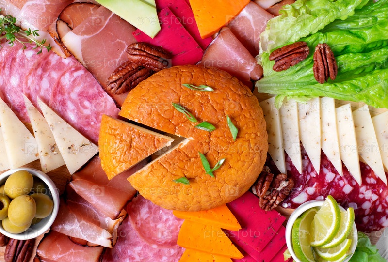 Ассорти из сыра и колбасы. Ассортимент подаваемых закусок. Вид сверху. Полный кадр