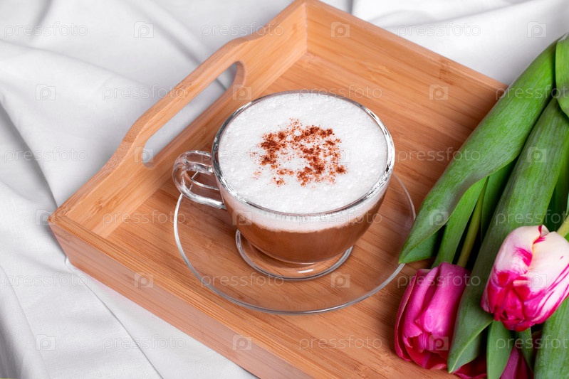 Кофе с корицей и розовыми тюльпанами на деревянном подносе в постели. Романтический сюрприз