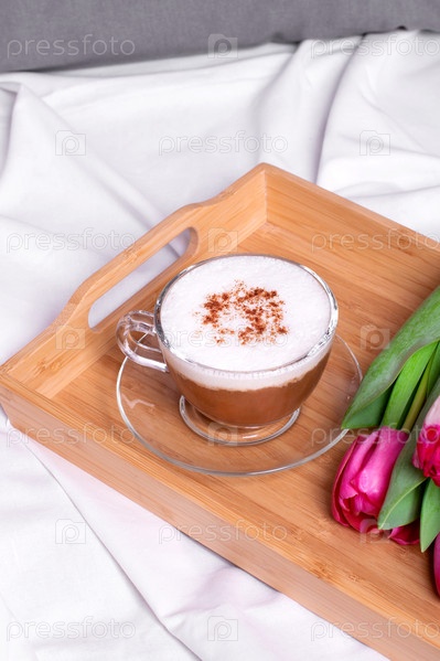 Кофе с корицей и розовыми тюльпанами на деревянном подносе в постели. Романтический сюрприз