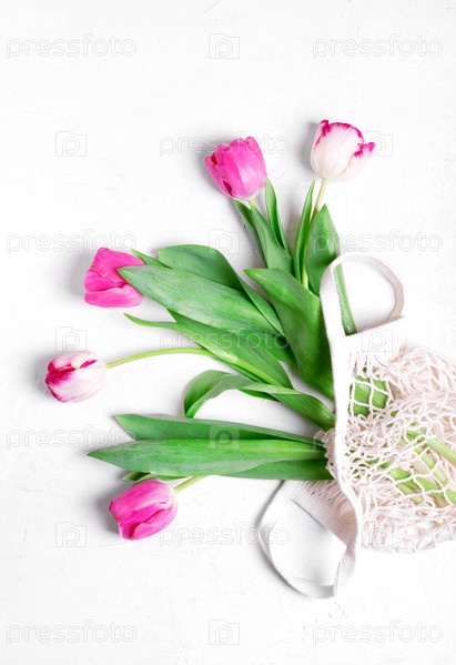 Букет розовых тюльпанов в сетчатом мешке на белом