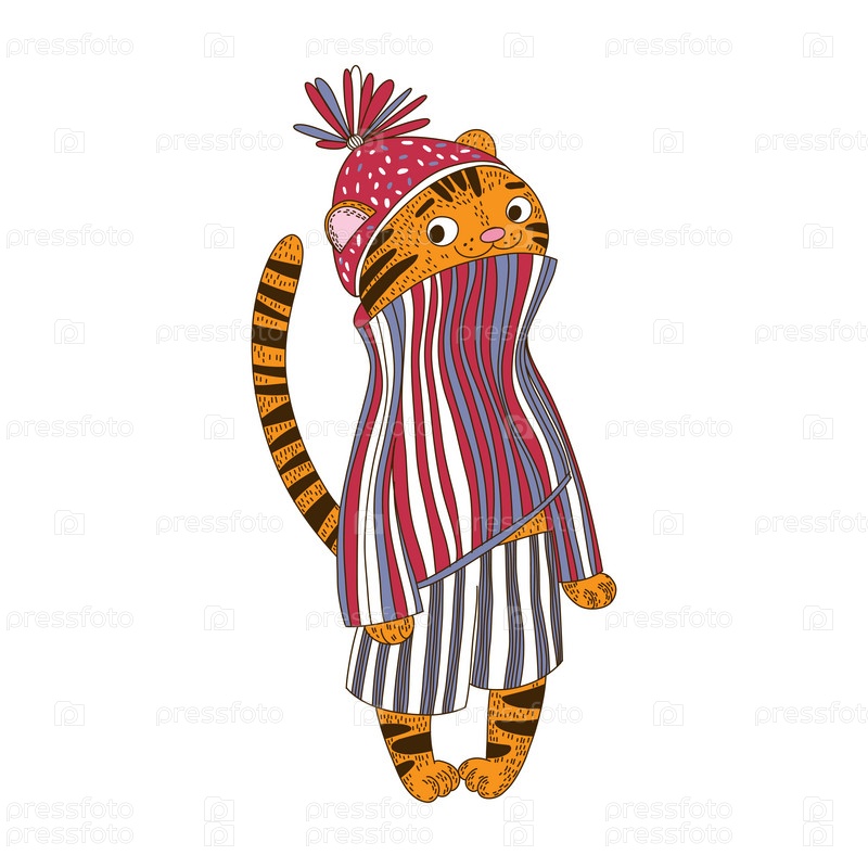 Симпатичный мультяшный тигренок в шляпе и свитере. Векторная иллюстрация на белом. Изолированный персонаж. Идеально подходит для приглашений, поздравительных открыток и в качестве элемента дизайна. Животное символ нового 2022 года