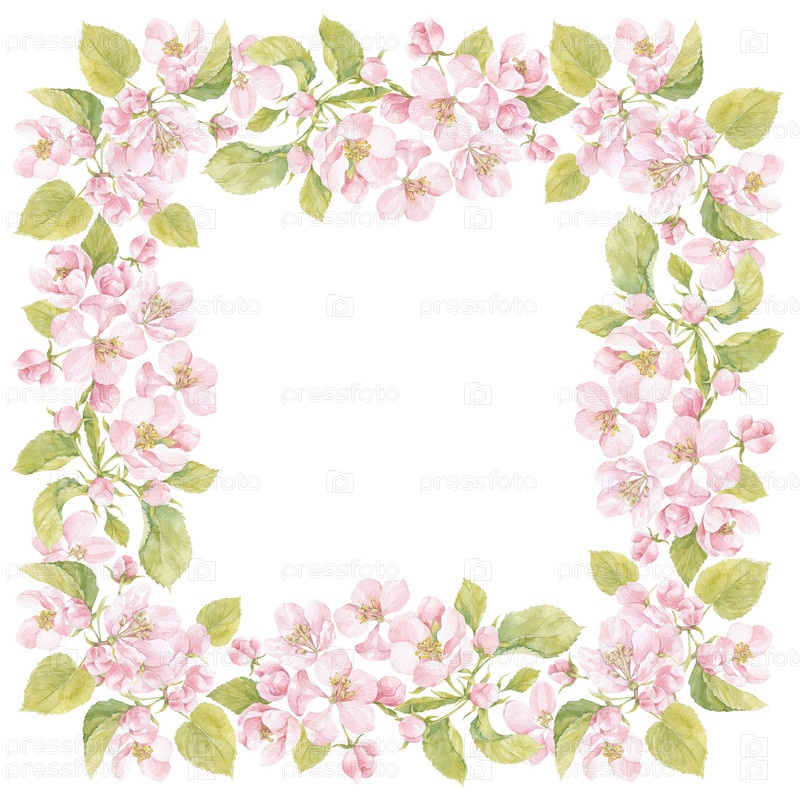 Квадратная акварельная рамка с цветущими ветвями яблони на белом. Иллюстрация с местом для текста может быть использована для создания открытки, меню или пригласительного билета