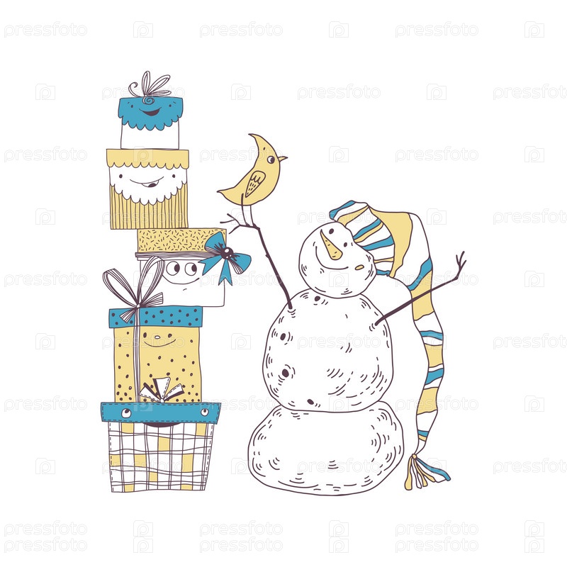 Праздничная векторная иллюстрация с мультяшным Снеговиком с птичкой и подарочными коробками на белом. Идеально подходит для приглашений, открыток, шаблонов дизайна обложки