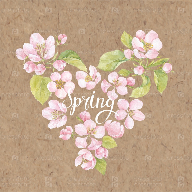 Весенний фон. Цветущие ветки яблони на крафт-бумаге. Композиция в форме сердца. Акварель. Идеально подходит для поздравительных открыток и приглашений или элемент вашего дизайна