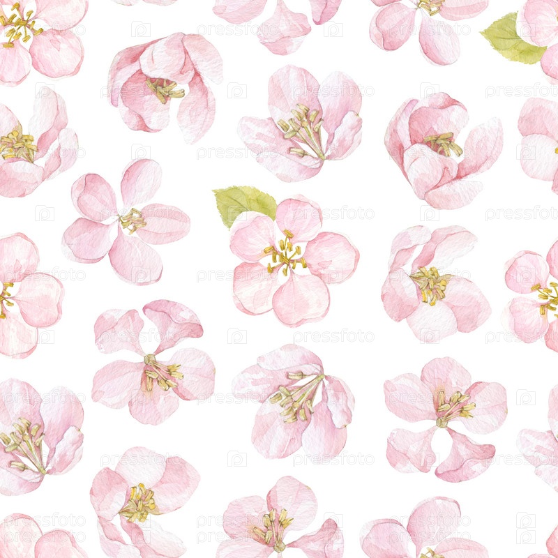 Бесшовный узор с цветами яблони на белом. Цветочный акварельный фон. Идеально подходит для шаблонов дизайна, обоев, упаковки, ткани и текстиля
