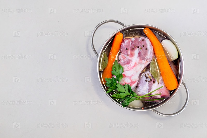 Кастрюля с ингредиентами для приготовления мясного бульона находится на серой поверхности