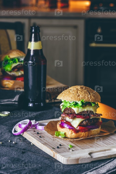 Готовый чизбургер на разделительной доске с бутылкой пива на Т